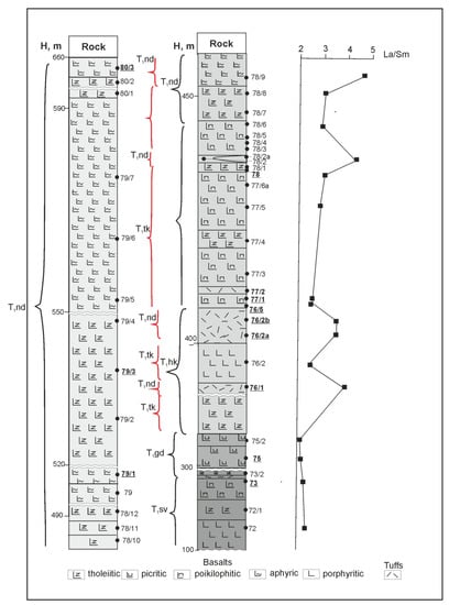 The analytical data (Table 2) confirmed the presence of rocks of the lower formations (Syverminsky and Gudchikhinsky) in the bottom of the section. The Syverminsky formation comprises twelve flows of basalt and trachybasalt with poikilophitic, tholeiitic structure and that are, in total, 110 m thick. These rocks are overlain by the picritic basalt of the Gudchikhinsky Formation (two flows up to 45 m in total thickness).
