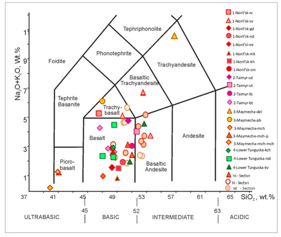Classification IUGS diagram of SiO2–Na2O + K2O for volcanic rocks of the Siberian trap province. Data in Table 3 (analyses in this diagram and in Figures 6, 8 and 9 were calculated to 100%).