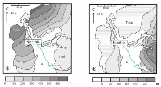 Isopach map for the Nadezhdinsky (a) and Tuklonsky (b) Formations. Data after [14] with changes. Thickness of formations is given in m (scales under maps).