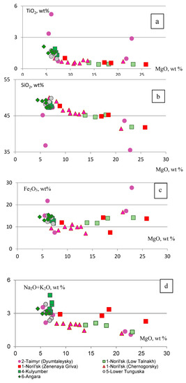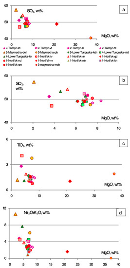 The intrusive rocks’ diversity is a specific feature of the northern areas of the Siberian trap province, the Norilsk-Taimyr and Maymecha-Kotuy areas [14,34,45,70]. The intrusions of these regions demonstrate the great variety in MgO and TiO2 contents (Figure 11) and are typical of the effusive rocks. As for the Angara-Taseeva syncline and the Tunguska syneclise, the majority of intrusions and volcanic rocks in these regions regardless of their age demonstrate the uniform geochemical features similar to lavas of the upper formations from the Norilsk region.