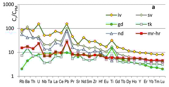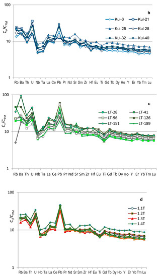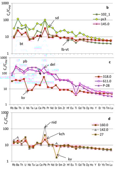 Representative spider diagrams for volcanic rocks of the Siberian trap province. Here and in Figure 6—normalized to Primitive Mantle, after [91]. Volcanic rocks, areas: (a) Noril’sk (1, number of area in Figure 1b), (b) Taimyr (2), (c) Maymecha-Kotuy (3), (d) r. Lower Tunguska valley (5). Data in Figure 7a are shown after [14]; data in Figure 7b–d are given in Table 3. Formations: iv—Ivakinsky, sv—Syverminsky, gd—Gudchikhinsky, tk—Tuklonsky, nd—Nadezhdinsky, mr—Morongovsky, khr—Kharaelakhsky, lb—Labaksky, vt—Verkhenetamsky, del—Delkansky, pb—Pravoboyarsky, bt—Betlinsky, nid—Nidymsky, kch—Kochechumsky, kv—Korvunchansky.