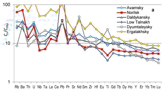 In the Putorana plateau and the central part of the Tunguska syncline (Figure 1a), the WPB-type volcanic rocks constitute the Ayansky and Honnamakitsky formations, which completely correspond to the Morongovsky and Mokulaevsky formations in the Noril’sk region (see captions to Figure 2a). In the southern part of the Tunguska syncline, several formations have been recognized, i.e., Tutonchansky and Korvunchansky (tuffs) and Nidymsky, Kochechumsky and Yambukansky (lavas) [63]. These formations are typical WPB and very close to each other (as will be demonstrated below).