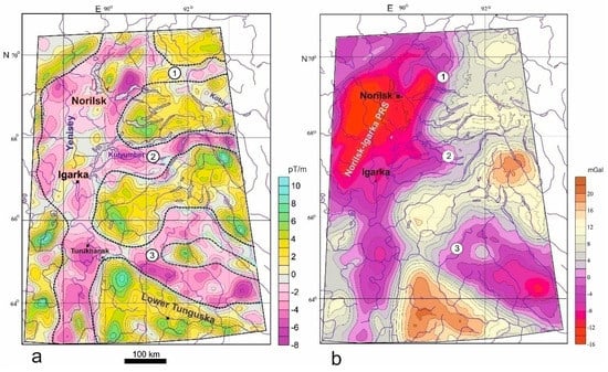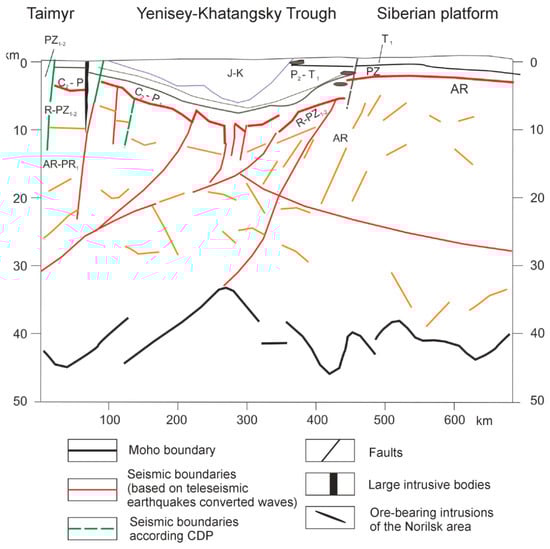 The discovery of PGE–Cu–Ni deposits in the Noril’sk and in Taimyr regions stimulated the interest in the tectonic structure of these regions [97,98]. This area, including the Yenisey-Khatanga trough and adjacent structures (Figure 1a), fundamentally differs from the rest of the Siberian platform: firstly, there is a low-viscosity zone at a depth of around 80 km as was mentioned earlier (Figure 1c). Secondly, the Archaean-Proterozoic crystalline basement is covered here by deep volcanic-sedimentary deposits ranging in age from Ediacaran to Lower Paleozoic in contrast to the thin cover of the Siberian platform [18]. Some of these sediments occur in rift zones (Figure 12) characterized by specific magmatism and mineralization. Geopotential field tomography data demonstrate the existence of a large fault zone which penetrates the upper mantle and extends into the Earth’s crust [22]. The dislocation has the shape of a flattening of a funnel extended in the north–south direction with a submerging channel in the upper mantle located in the Igarka area (Figure 1c).