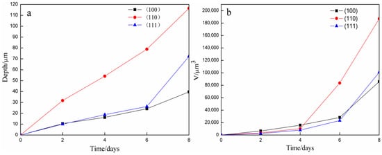 Crystal direction depth and volume changes of etching pits. (a) Depth changes, and (b) volume changes.