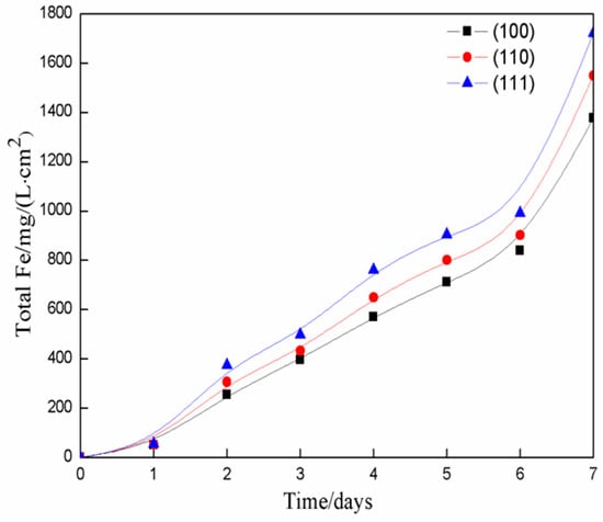 Considering the incomplete statistics of etching pits, the concentrations of “total iron” ion were measured in different crystal directions. Figure 5 shows the variation of the “total iron” concentration with time. This figure indicates that different oxidation rates are observed in different crystal directions. The (111) plane shows a higher oxidation rate compared with the (100) and (110) planes. The directional oxidation rate is . This finding agrees with the results of Ndlovu and Monhemius [] and is probably due to the difference in geometric arrangement of atoms in different crystal directions. The atomic arrangement of the pyrite (111) plane is –S–S–S–S– or –Fe–Fe–Fe–Fe–, and the (100) plane is –Fe–S–S–Fe–. The S–S bond in pyrite is weaker than that of the Fe–S bond []. Therefore, the (100) plane is more stable. The results indicate that the surface atomic arrangement is important for the physical and chemical behavior of pyrite. Moreover, crystal growth theory (periodic bond chain (PBC) theory) describes that the morphology of crystals is obtained from the geometrical characteristics of the internal structure of crystals and the energy of particles. A PBC is an uninterrupted bond chain with periodic repetition of the strongest bond in a certain direction of crystallization. The plane refers to the F surface when more than two PBCs are parallel to a certain plane, in which its mesh is dense and flat and its growth rate is small. The plane refers to the S surface when only one PBC is parallel to it, which has a small and few secondary directions on the crystal. This plane is also called the stepped face. The plane refers to the K surface when no PBC is parallel to it, which is also called the kinked face. Its growth rate is the fastest and easier to disappear []. In pyrite, the Fe–S bond is stronger than that of S–S bond. Two periodic Fe–S bond chains are parallel to the (100) plane, which belong to the F surface and indicate its stable property. The (110) plane has one parallel PBC, which shows a fast oxidation rate. Meanwhile, the (111) plane without any parallel PBC exhibits a faster oxidation rate. This theory perfectly explains our experimental results.
