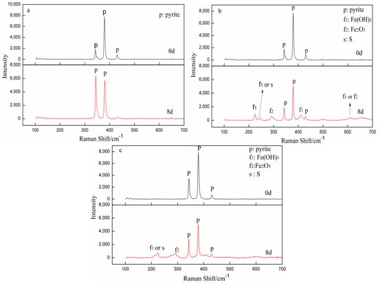 The Raman spectra for the pyrite (111) plane in Figure 6c exhibit two weak and broad peaks. The first peak is located at 220–234 cm−1, which is possibly due to the mixture of Fe(OH)3 and S on the pyrite surface. The second peak is located at approximately 280 cm−1, which can be ascribed to Fe2O3.
