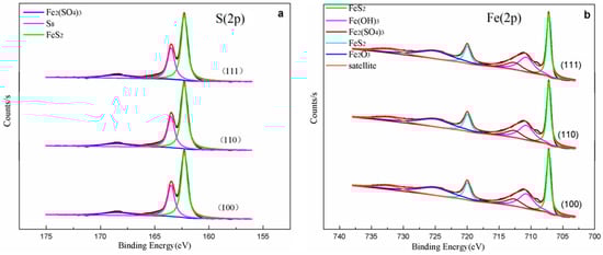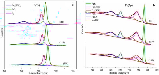 XPS spectra of pyrite (100), (110), and (111): S(2p) (a), and Fe(2p) (b).