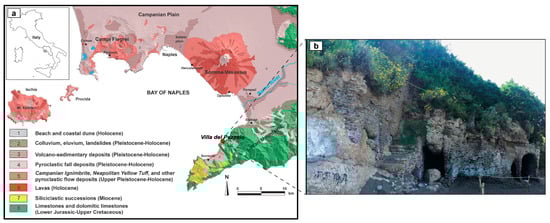 - De Bonis, A.; Febbraro, S.; Germinario, C.; Giampaola, D.; Grifa, C.; Guarino, V.; Langella, A.; Morra, V. Distinctive Volcanic Material for the Production of Campana a Ware: The Workshop Area of Neapolis at the Duomo Metro Station in Naples, Italy. Geoarchaeology 2016, 31, 437–466. [Google Scholar] [CrossRef]