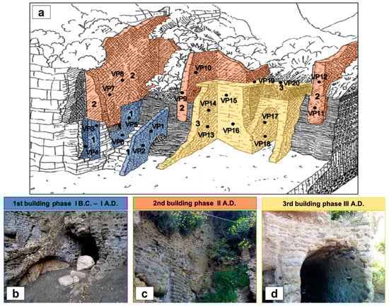 - Graziano, S.F.; Di Benedetto, C.; Guarino, V.; Rispoli, C.; Munzi, P.; Cappelletti, P.; Morra, V. Technology and building materials in Roman age (1st BC—2nd AD): The “Mausoleo Della Sfinge” from the archaeological site of Cuma (Italy). Mediterr. Archaeol. Archaeom. 2018, 18, 81–94. [Google Scholar]