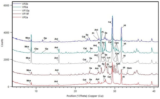 | VP13 | group C | Cal | Anl, Lct, Sa, Pl, Cpx, Mca, Cal | Qz, Cal, Hem, Sa, Cpx, Pl | Hl |