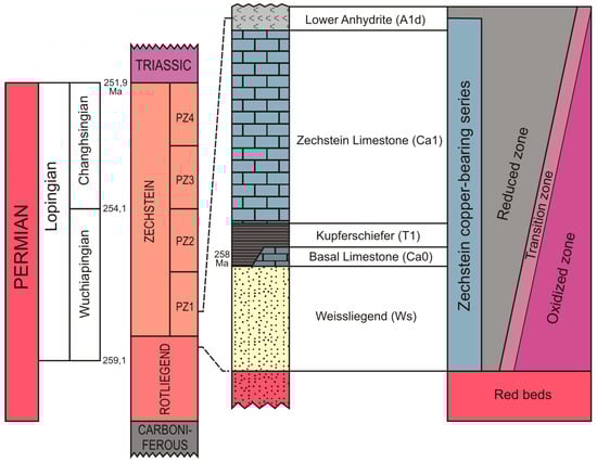 Deposition in the Polish Zechstein Basin commenced with flooding of the continental Rotliegend basin as a result of rifting-induced subsidence combined with a contemporaneous rise in sea level [53]. The Zechstein Basin, about 1700 km long, extended from eastern England to western Lithuania, Estonia and Belarus. The transgression of the Zechstein Sea occurred in the Lopingian (Figure 1; [55,56]). As a result of transgression and cyclically progressing changes in the Zechstein Basin paleogeography, four basic cycles were deposited: Z1 (Werra), Z2 (Stassfurt), Z3 (Leine) and Z4 (Aller). Early Zechstein (the first and the second Zechstein cyclotems) is probably the equivalent of the upper Wuchaiaping (254.1–259.1 Ma), while the late Zechstein (the third and fourth Zechstein’s cycloteme) corresponds to the Changhsing (251.9–254.1 Ma).