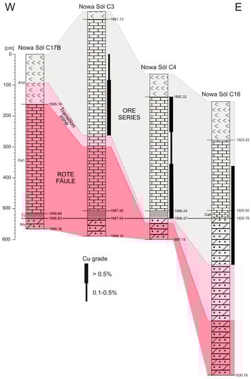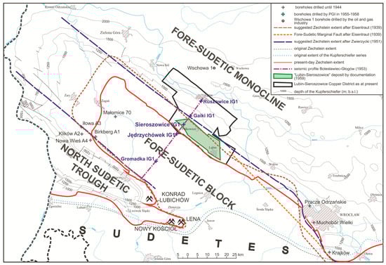 Geological research in the Fore-Sudetic Monocline dates back to deep drilling in Krajkowo near Wrocław [32]. Next boreholes that penetrated the lower Zechstein units were drilled before the World War II near Wrocław: Pracze Odrzańskie (1938) and Muchobór Wielki (1939) with low-grade copper intersections of 0.08% Cu [31]. Other drilling activities were carried out in the vicinity of Żagań, where Rotliegend and Zechstein sediments were found with evidences of oxidation but without significant copper concentration. Eisentraut [31] rightly recognized that the Zechstein profiles in the vicinity of the Wrocław region are connected to their counterparts in the North Sudetic Trough (Figure 2). It was suggested that those localities did not promise the existence of economic deposits north of the Variscan structures of the Sudetes [31]. Therefore, the area located north-west of Wrocław was marked as insignificant for copper on the published maps [32,33,34].