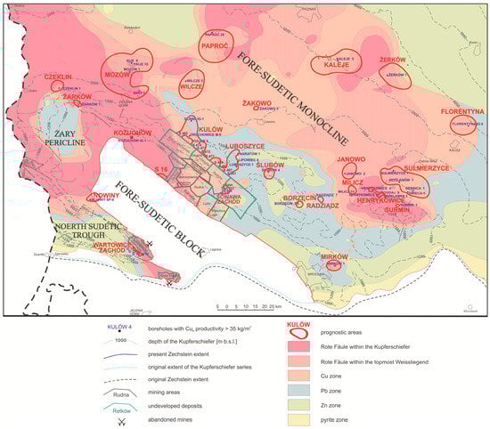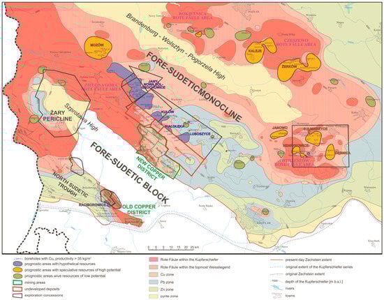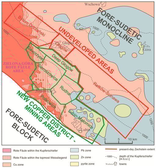 The current state of knowledge on prospective copper areas in relation to Rote Fäule areas and metal zonation (modified after Oszczepalski et al. [24]).