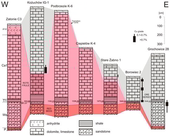 Petrological and geochemical studies of the Zechstein copper-bearing series indicated that the oxidation-reduction interface, both vertically and horizontally, is the boundary separating the oxidized Rote Fäule facies, barren in copper and silver, from reduced sediments with ore mineralization (Figure 1). Close relationship between the Rote Fäule areas and the orebodies indicated that determination of the ranges of oxidized zones is an extremely important exploration guide for the Kupferschiefer-type deposits [13,14,15,16,17,18]. Results of exploration drilling by the Polish Geological Institute-National Research Institute (PGI-NRI) and studies of cores from boreholes drilled by the Polish Oil and Gas Company (PGNiG) have been summarized in consecutive reports [18,19,20,21,22,23]. New studies of numerous drill cores strongly indicate that the Lower Zechstein rocks contain a very large volume of resources [24].