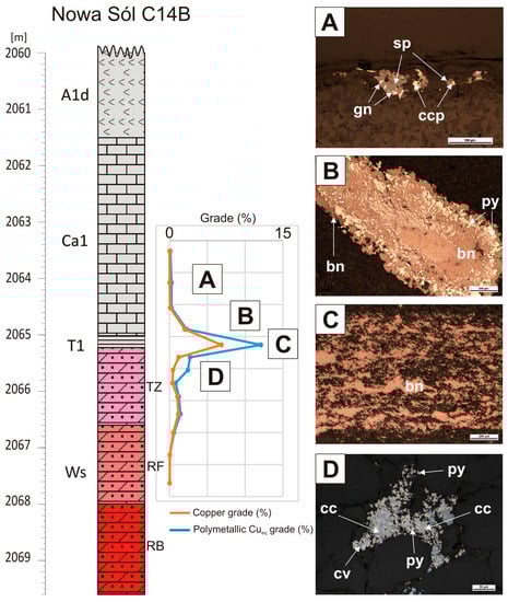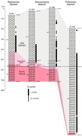 Extremely important for understanding the mineralization processes is the presence of the transition zone above the oxidized complex, defined initially by [17,59]. Its thickness varies from several millimeters in the Kupferschiefer horizon to several meters in the Weissliegend sandstone, the basal limestone (in the North Sudetic Trough) and the Zechstein Limestone. The upward transition of oxidized rocks into sulfide-containing reduced sediments is characterized by a gradual change from reddish-brown rocks through grey ones with red spots to dark-grey or black sediments. This change is accompanied by a distinct variability of various parameters (Table 2). One characteristic feature of this transition is the low-grade remnant mineralization represented by coexisting iron oxides (hematite and goethite), metal sulfides (covellite, pyrite, marcasite and minor chalcocite, bornite and chalcopyrite) and noble metals (native gold, Au-Ag alloys and Pd-arsenides).