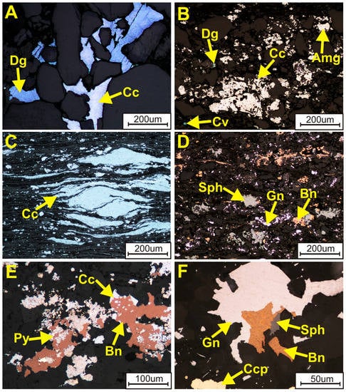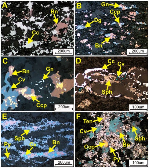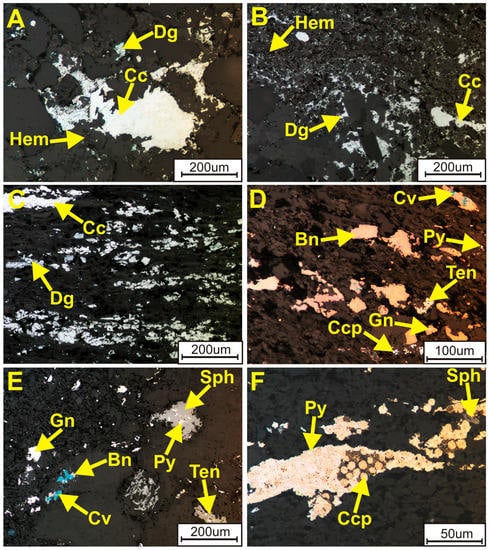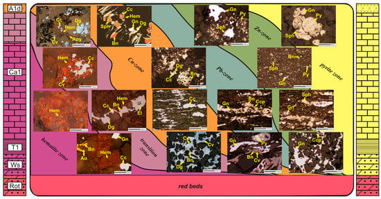 The metals are zoned both vertically and horizontally in a sequence of: Fe3+(Au, Pt, Pd)–Cu(Ag)–Pb–Zn–Fe2+ in distinct zones around oxidized areas and the typical paragenetic sequence includes hematite (goethite)-covellite-chalcocite-bornite-chalcopyrite-galena-sphalerite-pyrite in which hematite postdates sulfides, Cu-S-type sulfides are younger than Cu-Fe-S-type sulfides and framboidal pyrite is the earliest (Figure 6). Locally, the Cu-Fe-S system is accompanied by Cu-As-Sb-S sulfides, galena, sphalerite and pyrite [18,36,68,69,70,85,86]. Although the ore mineral zonation pattern is observed as being complex on a mine scale [65,68,69], it is clearly defined on a regional scale [18]. In areas with the highest copper concentrations, chalcocite, digenite and covellite predominate over the other sulfides whereas in areas further from the Rote Fäule area bornite, chalcopyrite, galena and sphalerite successively prevail. Farther away from oxidized areas, high- and low-grade mineralization is represented by a bornite-chalcopyrite assemblage with minor digenite, chalcocite, galena, sphalerite and pyrite. In distal areas, low-grade polymetallic ore mineralization is predominated by a chalcopyrite-galena-sphalerite association commonly accompanied by numerous pyrite and marcasite grains.