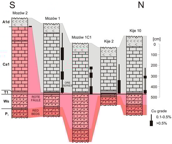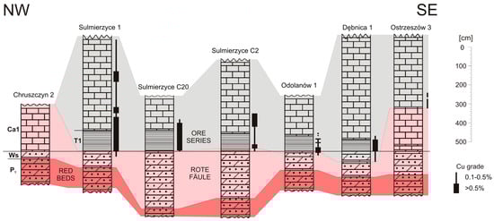 Correlation of selected profiles of the Zechstein copper-bearing series across the eastern part of the Zielona Góra Rote Fäule area. A1d—Lower Anhydrite; Ca1—Zechstein Limestone; T1—Kupferschiefer; Ws—Weissliegend; P1—Rotliegend.