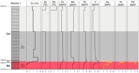 Using standard processing software, the thickness of ore intervals was computed along with average concentration and copper productivity (surface density of Cu) in the ore series. The productivity was calculated using the formula: Q = T × P × C × 10, where: Q—copper productivity (kg/m2) in a sampled sequence with metal concentration ≥0.5% Cu plus Ag equivalent; T—thickness of the mineralized sequence (m); P—weighted Cu equivalent grade (%) and C—bulk density of mineralized rocks (t/m3). The following values of bulk density were used: 2.3 for sandstones, 2.5 for dolomites and limestones and 2.6 for shales.