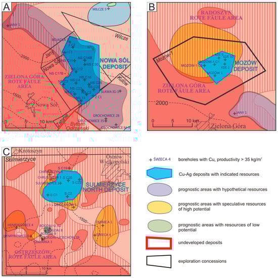 A significant increase in new data took place in the recent years [21] due to a detailed investigation of most of the available cores, which enabled the construction of maps with subsequent versions of oxidized and reduced areas allowing new assessments of resource prospects (Figure 3). Subsequent reports have specified the areal distribution of the Rote Fäule and prospective areas [22,23]. Recently Zientek et al. [41]) synthesized available information and estimated the location and quantity of undiscovered copper resources associated with the Kupferschiefer series. All data and large-scale metal zonation with respect to the oxidized rocks indicated that prospects adjacent to the oxidized areas represent the greatest potential. Among the demarcated prospects, the expected northwest-trending extension of the L-S deposit and the Sulmierzyce area seemed to be most interesting [42,43,44,45]. The increasing number of studied boreholes allowed Oszczepalski et al. [24] to present a summary with 38 prospective areas. Consequently, based on all studies of boreholes, extensive drilling operations were recently performed within several exploration concessions both on the Fore-Sudetic Monocline, in the North Sudetic Trough and in the Żary Pericline [30].
