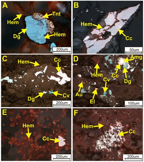 Remnant sulfides occur mostly as finely scattered grains, rarely as mutual composites. Most remarkable are partial or total replacements of Cu sulfides by hematite and goethite [14,17,39,59]. Cu sulfides and pyrite grains are commonly corroded, invaded, veined and rimmed by iron oxides and only remnants are retained as minute grains dispersed in red-pigmented rocks [40,74,82,83,84]. Locally, hematite forms intergrowths with digenite or myrmekitic lamellae in bornite [85]. Covellinization of copper sulfides is common. Intergrowths and inclusions of native gold have been found in hematite [76]. Locally (e.g., in the North Sudetic Trough) sulfide aureoles around red spots and inclusions of bornite and chalcopyrite within the red spots have been identified.