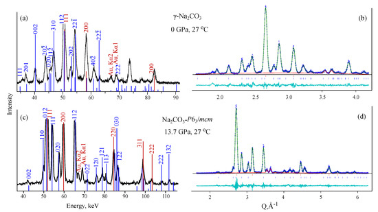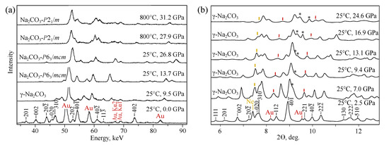 In our previous work [50], we suggested the transition from -NaCO to -NaCO at 1–2 GPa. Both phases have similar structures, complicated by the incommensurate modulations in the case of -NaCO [39]. Distinguishing these two phases in our MA energy-dispersive diffraction patterns is problematic and here we designate both of them as -NaCO, assuming that this can be - or -phase.