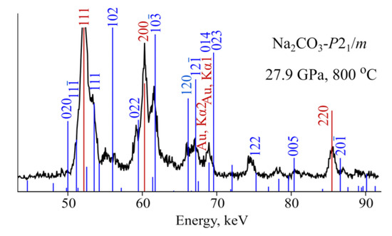 Despite a relatively small number of findings of simple alkaline and double alkaline–alkaline-earth carbonates, gregoryite together with nyerereite form the main part of unique natrocarbonatites rocks of the Oldoinyo-Lengai volcano (Tanzania) [6]. Nahcolite (NaHCO), eitelite and nyerereite were also found in carbonatitic inclusions in diamonds from the Juina, Mato Grosso State, Brazil [21,22]. The summary of other findings of double alkaline–alkaline-earth carbonates can be found elsewhere [5]. All these findings gave rise to intensive experimental investigation of NaCO and KCO melting curves in the pressure range of the upper mantle and transition zone of the Earth [19,23,24,25,26,27,28,29]. The melting curve of NaCO was found to be smooth in the range of 3–18 GPa [23], while on the melting curve of KCO, two kinks, at 5 and 9 GPa, have been found at 2–20 GPa [24,25]. High-pressure transitions in solid phases of NaCO and KCO have been investigated only in one work, published as a PhD thesis [24]. In this work, three high pressure phases of KCO, new phase 1, new phase 2 and new phase 3 have been revealed. Crystal structures of these phases have not been determined and are still unknown.