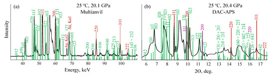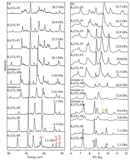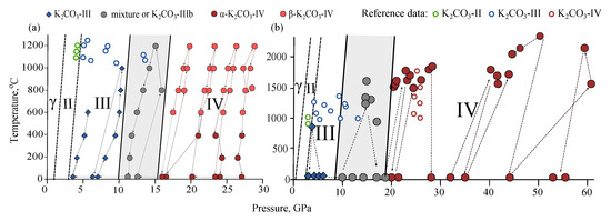 The obtained phase diagrams according to MA and DAC-APS experiments are shown in Figure 6. The phase diagrams from these two experimental settings are consistent with each other. They are also consistent with available data on melting curves and high-pressure phase transitions of KCO [24,25,26], suggesting one phase transition at 3 GPa and another-in the range of 13–25 GPa.