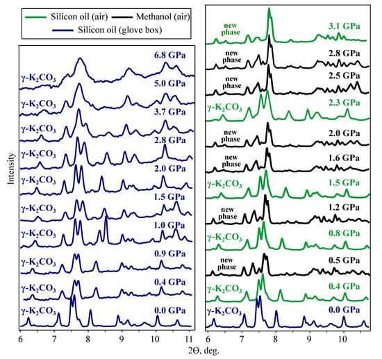 In dry experiment (I), -KCO is stable up to the maximum reached pressure of 6.8 GPa. The observed amorphization, starting from 3 GPa, is due to non-hydrostatic compression in silicon oil [55]. In wet experiment (II), the new phase or phases are observed above 3.1 GPa (Figure 8). The diffraction pattern of this phase is different from diffraction patterns of KCO-III obtained in MA and DAC-APS experiments at nearly the same pressures (Figure S4).