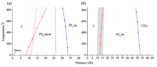 The calculated P-T boundaries for /mcm and /m equilibriums correctly reproduce experimental results on phase transitions of NaCO (Figure 10a). According to calculations, both /mcm and /m structures are stable within all of the investigated temperature range, likely up to the melting temperatures. The upper stability boundary of structure of NaCO, revealed in our previous calculations [31], is restricted to nearly 0 C (Figure 10). Due to sufficient structural difference between and phases, the transformation is hindered by the kinetic of the process.