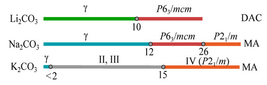 - Gavryushkin, P.N.; Behtenova, A.; Popov, Z.I.; Bakakin, V.V.; Likhacheva, A.Y.; Litasov, K.D.; Gavryushkin, A. Toward analysis of structural changes common for alkaline carbonates and binary compounds: Prediction of high-pressure structures of Li2CO3, Na2CO3 and K2CO3. Cryst. Growth Des. 2016, 16, 5612–5617. [Google Scholar] [CrossRef]