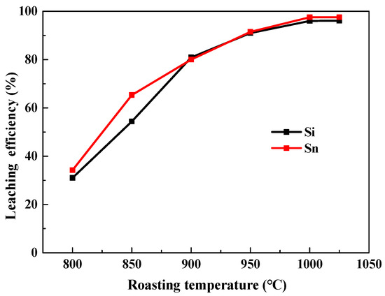 It was observed from Figure 1 that the roasting temperatures had significant impact on leaching efficiency of Sn and Si. The leaching efficiency of Sn and Si increased with increasing the roasting temperatures. The leaching efficiency of Sn and Si increased significantly as roasting temperatures increased from 800 °C to 1000 °C. At 1000 °C, the leaching efficiency of Sn and Si was almost the same level, 97.5 wt. % and 96.1 wt. %, respectively. The melting point of Na2CO3 is reported as 851 °C, and melted Na2CO3 is inclined to volatilize, which resulted in equipment corrosion at higher temperatures [33,34]. Therefore, 875 °C is selected to be a suitable roasting temperature based on the previous study [14].