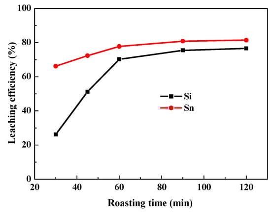 When the roasting time was further extended to 90 min, the leaching efficiency of Sn and Si almost stayed unchanged. As the roasting time was 120 min, the leaching efficiency of Sn and Si was 81.4 wt. % and 76.6 wt. %, respectively.
