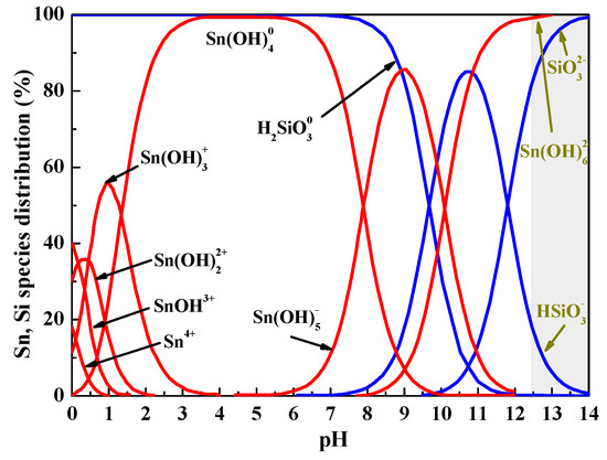 To further determine the existing forms of Sn and Si ions in the leachate, the solution chemistry of leachate with different pH value was analyzed. Dissolution thermodynamics of Sn and Si ions in aqueous solution was firstly discussed in the leaching process. In previous publications [35,36,37], it was reported that Sn(IV) might exist as Sn4+, SnOH3+, Sn(OH)22+, Sn(OH)3+, Sn(OH)4, Sn(OH)5, and Sn(OH)62−, while Si(IV) could exist as H2SiO3, HSiO3, and SiO32−. The mole fractions of metasilicic and stannum species at varying pH values were calculated based on previous studies (reaction constant (K) shown in Table 2) [38,39,40,41], and the results are shown in Figure 7.