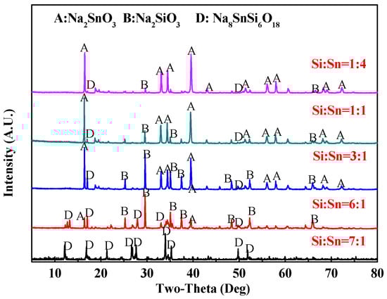 As observed from Figure 8, the main phases of the roasted samples were Na2SnO3, Na2SiO3, and a small amount of Na8SnSi6O18 when the SiO2/SnO2 mole ratio was 1:4. As the SiO2/SnO2 mole ratio increased from 1:4 to 7:1, the diffraction peak intensity of Na8SnSi6O18 increased significantly. Meanwhile, the diffraction peak of Na2SnO3 was gradually weakened and vanished. The Sn/Si theoretical value in Na8SnSi6O18 was 1:6. The results indicated that high Si content in cassiterite concentrates promoted the formation of Na8SnSi6O18, which decreased the conversion of SnO2 to Na2SnO3 during the roasting process.