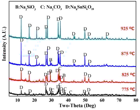 The effect of roasting temperature was then performed, and Figure 9 shows the XRD patterns of the samples roasted for 60 min at temperature range of 775–925 °C. SiO2/SnO2 mole ratio was fixed as 7:1.