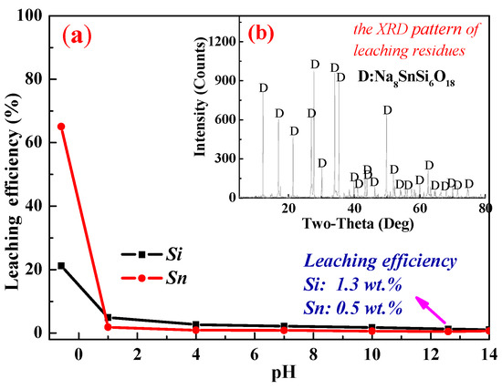 The effect of pH value on the leaching efficiency of Si and Sn was investigated systematically, and the results are shown in Figure 11a. The leaching efficiency of Sn decreased from 65.1 wt. % to 1.9 wt. % and Si from 21.2 wt. % to 4.9 wt. % as the pH value increased from −0.6 (4 mol/L HCl) to 1. The leaching efficiency of Si and Sn was substantially unchanged as the pH value increased further. The leaching efficiency of Sn and Si was 0.5 wt. % and 1.3 wt. % (in Figure 11a) when the pH value was 12.6 (0.05 mol/L NaOH). The XRD pattern of the leach residues obtained at pH of 12.6 is also presented in Figure 11b. It is seen from Figure 11b that Na8SnSi6O18 was the only phase in the residues. The results verified that Na8SnSi6O18 phase was almost insoluble and residual in the residues.