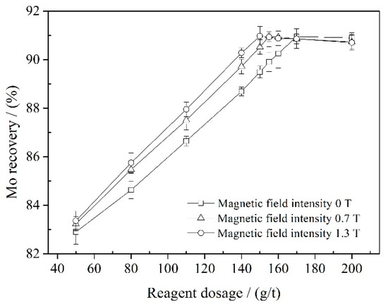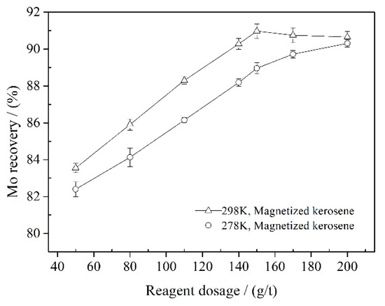 Figure 2 shows the influence of the magnetizing treatment on the optimized dosage of kerosene (298 K). The results illustrate that the molybdenum recovery first increased as the kerosene/MK dosage increased. Then, the recovery curve became flat after the optimized kerosene/MK dosage was obtained. At the magnetic field intensities of 0, 0.7, and 1.3 T, the optimized dosages were 170, 155, and 150 g/t, respectively. The result indicates that the magnetizing treatment affected the optimized kerosene dosage in the flotation of molybdenite. More specifically, the optimized kerosene dosage decreased in the flotation of molybdenite as the magnetic field intensity increased.