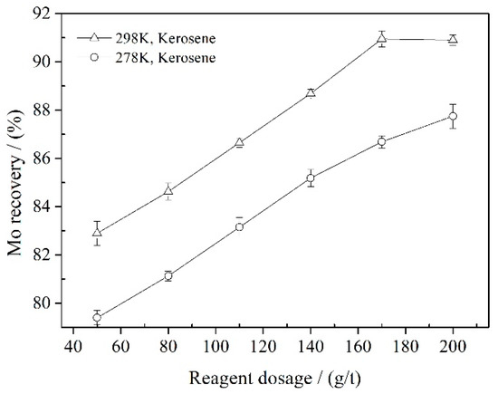 Figure 3 shows the influence of low-temperature pulp on the flotation performance of kerosene. The results indicate that the molybdenum recovery increased as the dosage of kerosene increased at the pulp temperature of 298 K; then, the recovery curve became flat after the dosage was more than 170 g/t. The maximum molybdenum recovery of kerosene as a collector was approximately 91% at 298 K. The molybdenum recovery increased as the dosage of kerosene increased at the pulp temperature of 278 K, and the recovery curve had a lower but clear gradient after the dosage was more than 170 g/t, which was not the same as the tests at the pulp temperature of 298 K. When the dosage of kerosene was equal to the optimum dosage of 170 g/t at 298 K, the molybdenum recovery of kerosene as a collector was 86.7% at 278 K. Even though the dosage of kerosene increased to 200 g/t, the molybdenum recovery was only 87.5% at 278 K. Compared with the tests at a pulp temperature of 298 K, the flotation recovery of kerosene as a collector decreased around 3.5% at 278 K. This indicates that the decrease of pulp temperature had a negative effect on the flotation of molybdenite when kerosene was used as the collector for molybdenite flotation. As the pulp temperature decreases, the flotation recovery of kerosene reduces.