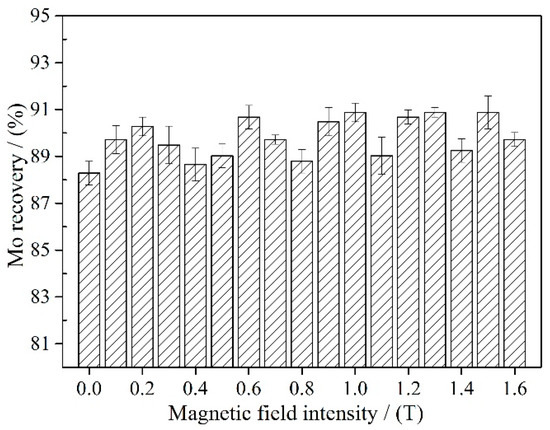 Figure 5 shows the molybdenum recovery of kerosene with different magnetization intensities (278 K). The results show that the molybdenum recovery of kerosene increased and decreased periodically as the magnetic field intensity increased. This indicates that the influence of magnetic field intensity on kerosene performance is not always positive or negative. The flotation performance of MK changed periodically as the magnetic field intensity increased, and within each period (period of the sine wave), there was an optimum magnetic field intensity.