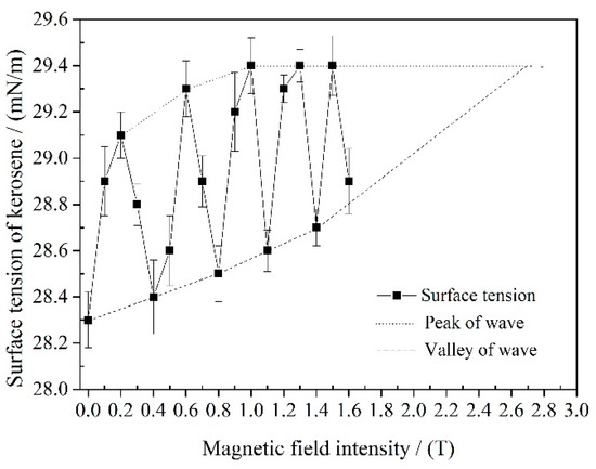 Figure 6 shows the influence of magnetic field intensity on the surface tension of kerosene (298 K). The results show that the surface tension of kerosene increased and decreased periodically with the increasing of the magnetic field intensity. The surface tension of kerosene increased by 0.3–3.7% after the kerosene was modified by a magnetic field. Then, the peaks/troughs of each continuous period were connected sequentially. Two curves on the trend of peak/trough development were obtained. Finally, the curves of peak and trough extension intersected at one point. This indicates that magnetizing treatment can improve the surface tension of kerosene. Further, the surface tension of kerosene may remain at a stable value as the magnetic field intensity increases when the magnetic field strength reaches a specific value.