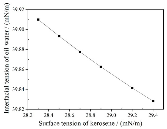 Based on the Girifalco–Good theory [25,26,27], the relationship between surface tension and the interfacial tension of kerosene–water at 298 K is shown in Formula (1) and Figure 7: