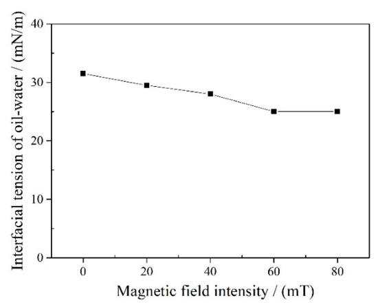 Figure 7 shows that as the surface tension of kerosene increased, the interfacial tension of kerosene–water decreased gradually. By combining the results of Figure 6 and Figure 7, it shows that magnetizing treatment can reduce the interfacial tension of kerosene–water. This is in agreement with Liang et al. (2013) [28], who reported that under the conditions of a magnetic field intensity of 60 mT and a magnetizing treatment time of 30 min at 303 K, the interfacial tension of kerosene–water was reduced by 19.2% (Figure 8). In this work, the magnetizing treatment time was 3 s. Therefore, the interfacial tension of kerosene–water decreased by 2.5%. This also indicates that magnetizing treatment time can affect the interfacial tension of kerosene–water.