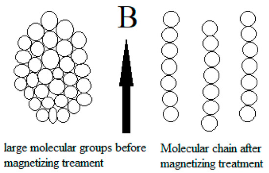Figure 9. Under the magnetic field, the structure of molecular groups of nonpolar hydrocarbon oil (NHO) tends to be a molecular chain [35].