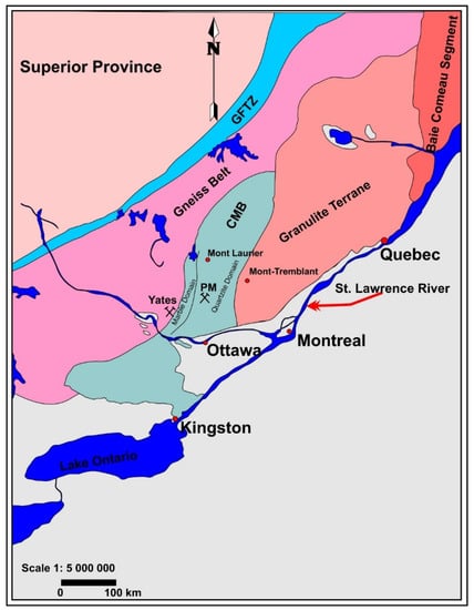 The geological setting and location of the Parker Mine with reference to Ottawa (Ontario), Montreal, the Yates prospect near Otter Lake, and Mont Tremblant (Quebec). After Wynne-Edwards [6]; GFTZ: Grenville Front Tectonic Zone, CMB: Central Metasedimentary Belt, PM: Parker Mine.