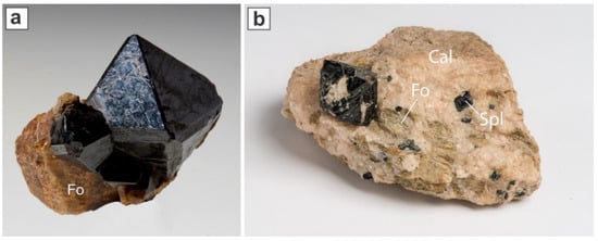 In the context of Grenville studies in Quebec, Ontario, and New York, the Parker phlogopite mine is the site of a classic “vein-dike” association [21,22]. Plates of phlogopite up to 15 cm across were extracted from the calcite-cored dikes. As stated earlier, the Parker mine is distinct from the norm in being associated with forsterite rather than diopside, such that the peridotite component of the vein-dike association is dunite rather than clinopyroxenite. In addition, the locality is well known for aesthetic black spinel crystals enclosed in the calcite matrix (Figure 2a).