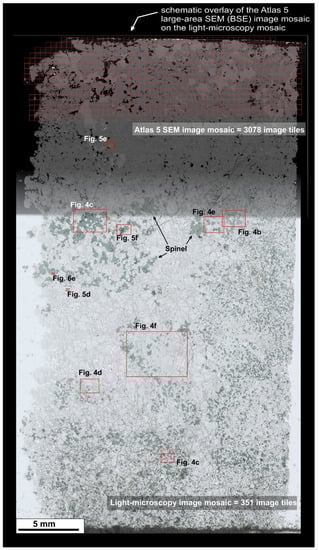 Large-area SEM image mosaics of both the thin sections and the spinel crystal epoxy mounts were acquired with the ZEISS Atlas 5 software (Version 5.2.3, Carl Zeiss Microscopy GmbH, Oberkochen, Germany) by using a ZEISS EVO MA 15 tungsten filament scanning electron microscope (SEM, Carl Zeiss Microscopy GmbH, Oberkochen, Germany) at Fibics Incorporated (Ottawa, Canada). The large-area light microscopy mosaics were imported into the respective Atlas 5 correlative workspace projects, aligned with the sample in the microscope, and the large-area SEM image mosaics were acquired with an accelerating voltage of 20 kV using the back-scattered electron (BSE) detector, a working distance of 11.0 mm, a 2.3 nA beam current (120 µm aperture), a 3 µs dwell time, and a resolution of 200 nm/pixel. The resulting large-area image mosaics of the two thin sections comprise 2824 (Parker Mine 5) and 3078 (Parker Mine 6) images, with each image tile consisting of 3072 × 3072 pixels (614.3 × 614.3 µm), and a total pixel count of 26.7 and 29.0 gigapixels (Figure 3 and Figure S1). The large-area image mosaics of the two spinel epoxy mounts comprise 1070 and 943 images, with each image tile consisting of 3072 × 3072 pixels (614.3 × 614.3 µm), and a total pixel count of 10.1 and 8.9 gigapixels.