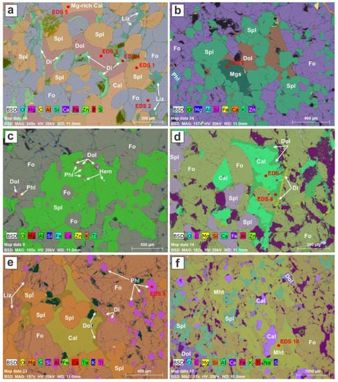 The minerals in the selected high-resolution areas have been identified on the basis of their energy-dispersive spectrum (EDS). Forsterite and spinel are both present in each of the six areas illustrated (Figure 4a–f), but proportions are quite variable. Each area contains one or two carbonate minerals in interstices, again in quite variable proportions. Calcite and dolomite share a boundary in Figure 4a; both crystallized from a single (Ca,Mg) carbonate melt. The calcite invariably contains a small amount of Mg, but in the area labeled Mg-rich calcite in Figure 4a, the Mg peak in the EDS spectrum is noticeably enhanced (Figure S4). In this suite, it is clear that not all the dolomite crystallized directly from a melt. In Figure 4d,e, for example, dolomite developed by the replacement of calcite, presumably by reaction of the melt with adjacent forsterite and perhaps also spinel. In Figure 4b, the carbonate melt crystallized magnesite and dolomite, which share a boundary. This is one of two occurrences of magnesite that we encountered. The lack of a uniform interstitial carbonate assemblage is symptomatic of a poorly blended melt phase.