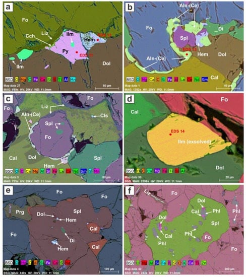 False-color EDS element-distribution maps of interstitial minerals and micro-inclusions in the spinel crystals of the dunite. (a) Pyrite occurs together with hematite and ilmenite at an interface between dolomite and forsterite. (b,c) Allanite-(Ce) and diopside are decorating a portion of a forsterite grain. (d) Ilmenite crystal at the interface between forsterite and dolomite. (e,f) Spinel crystals with hematite, dolomite, calcite, phlogopite, forsterite, and diopside inclusions. Symbols not yet defined: Aln-(Ce): Allanite-(Ce); Cch: Clinochlore; Ilm: Ilmenite. EDS point analyses 11 to 14 are shown in Figures S4 and S5.