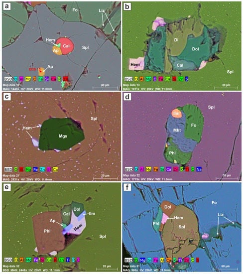 False-color EDS element-distribution maps of polymineralic micro-inclusions found in the spinel and forsterite crystals in the dunite. (a) Globular inclusion containing calcite, hematite and apatite. (b) Inclusion containing diopside, dolomite, calcite, and hematite. (c) Inclusion of magnesite decorated with hematite crystallites. (d) Inclusion containing forsterite, ilmenite, magnesio-hastingsite, and phlogopite. (e) Inclusion with phlogopite, calcite, dolomite, hematite, ilmenite, and apatite. (f) polymineralic inclusion in forsterite containing spinel, hematite, dolomite, and phlogopite. EDS point analysis 15 is shown in Figure S5.