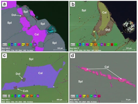 False-color EDS element-distribution maps of the spinel crystal. (a,b) Calcite and dolomite mineralization at the periphery of the spinel crystal. (c) Large calcite inclusion in the center of the spinel crystal (Figure S3). (d) Unusual string-like arrangement of calcite inclusions close to the periphery of the spinel crystal.